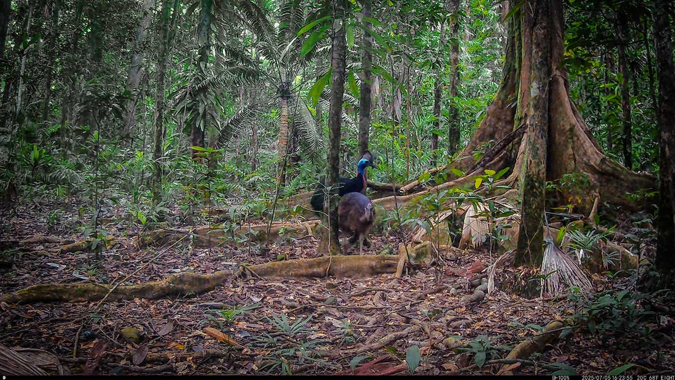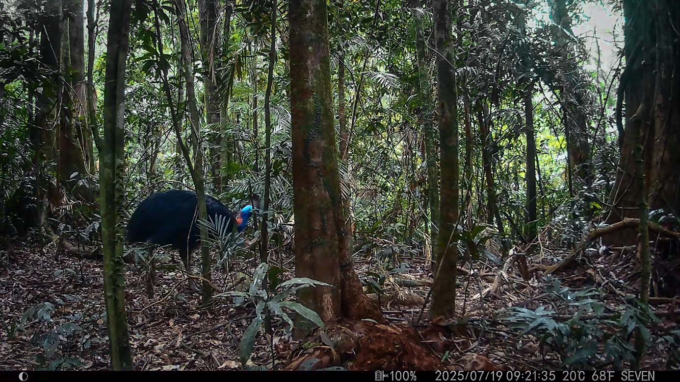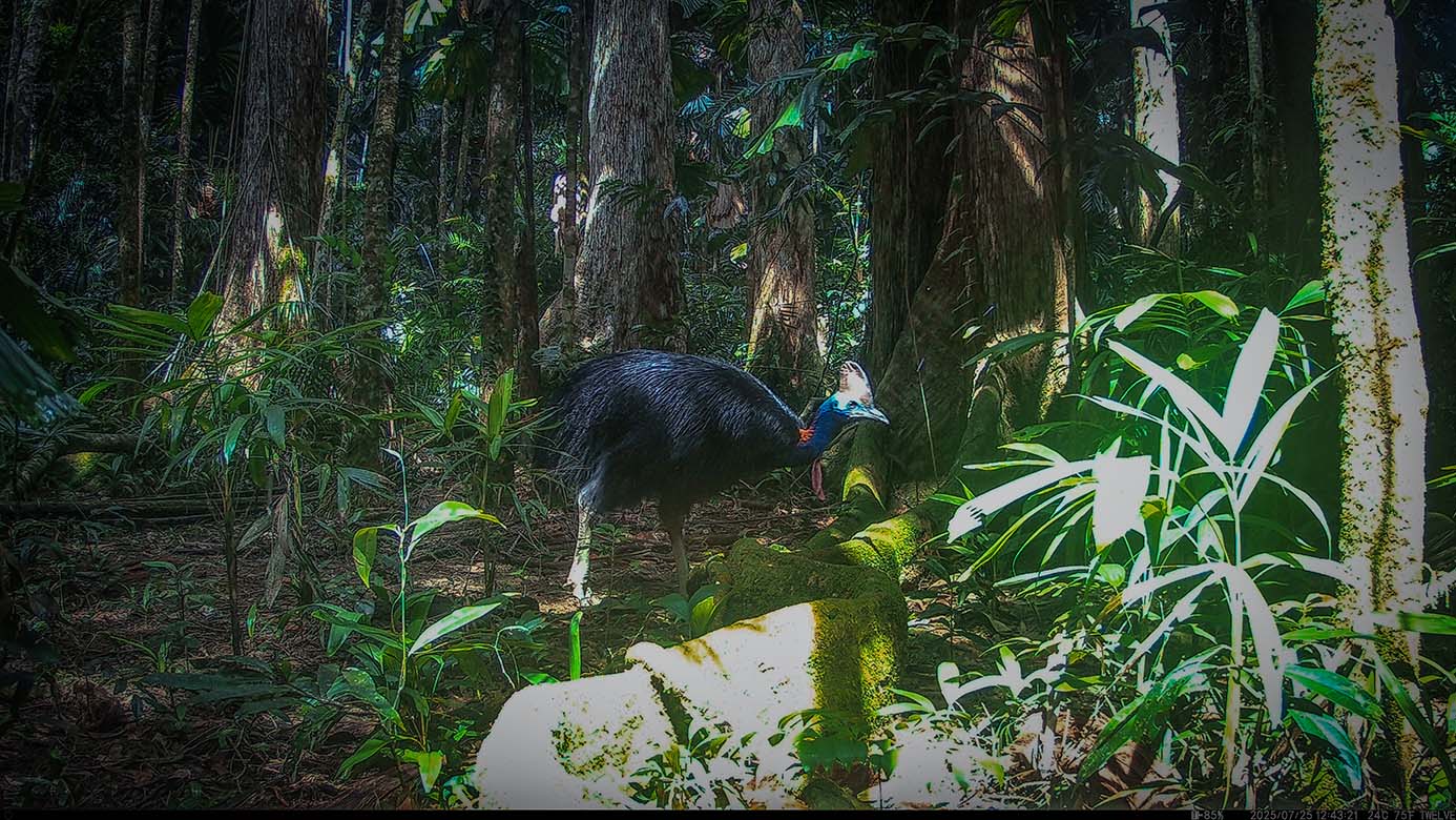 Reduced to less than 0.2% of Australia’s terrestrial landscape, cassowary habitat is also, per-unit-area, the most irreplaceable World Heritage property in the world and one of the 20 priority places in the Threatened Species Action Plan listed for improvement. With an estimated 30,000 invasive feral-pigs usurping cassowary habitat and large boars habitually pushing male cassowaries from their nests to devour eggs, cassowaries are at high risk of extinction.