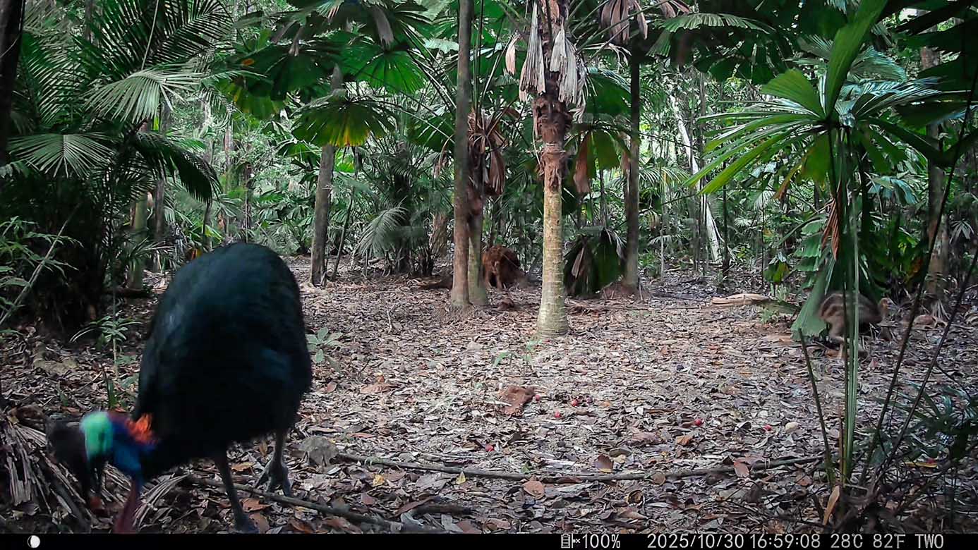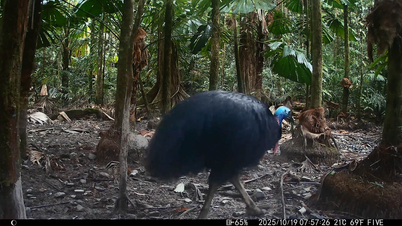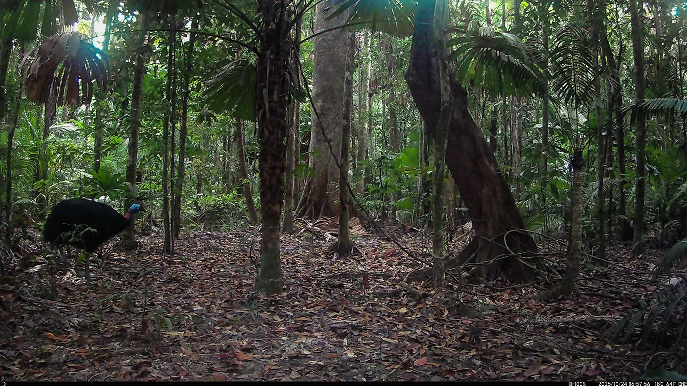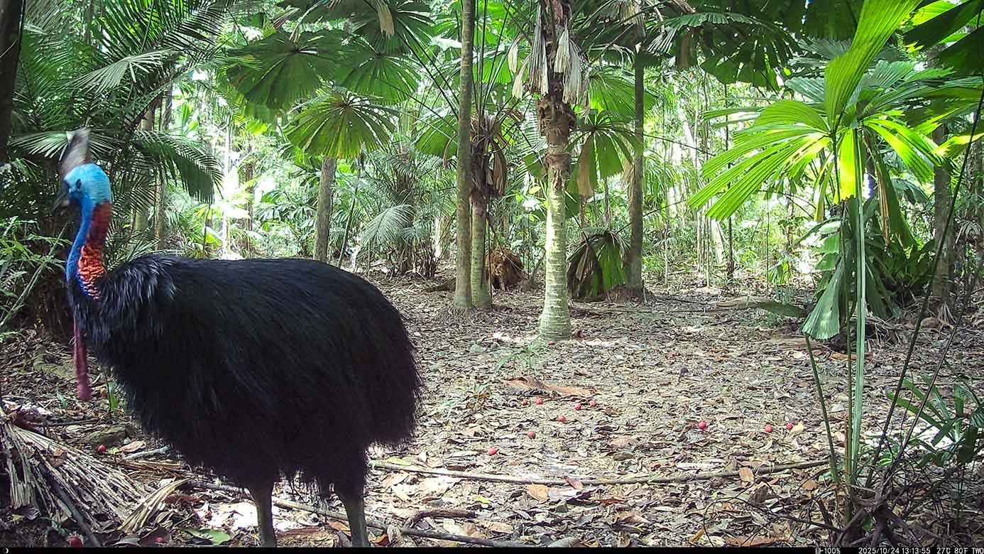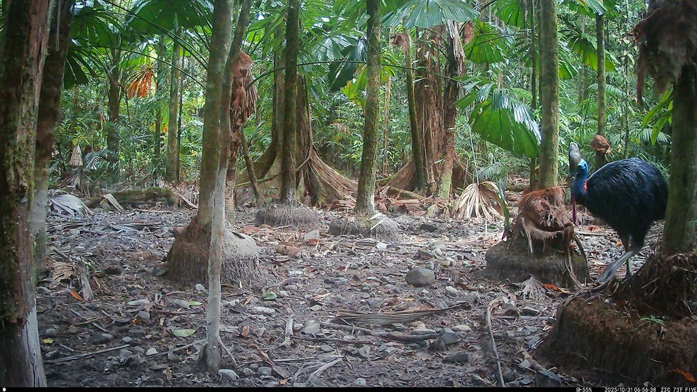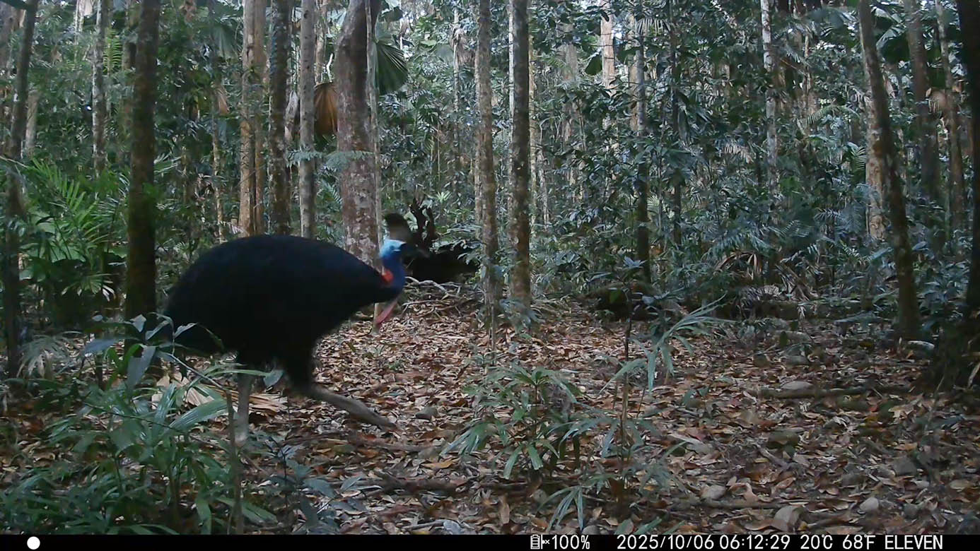 Camera Traps – October 2025 accrued 55-cassowaries, 43-dingoes and 56-feral pigs.  Against the cumulative monthly average, cassowary numbers fell by 43%, dingo numbers increased by 2% and feral-pig numbers plummeted by 71%.  Against October 2024, cassowary sightings rose by 104%, dingo numbers increased by 78% and feral-pig sightings decreased by 78%.