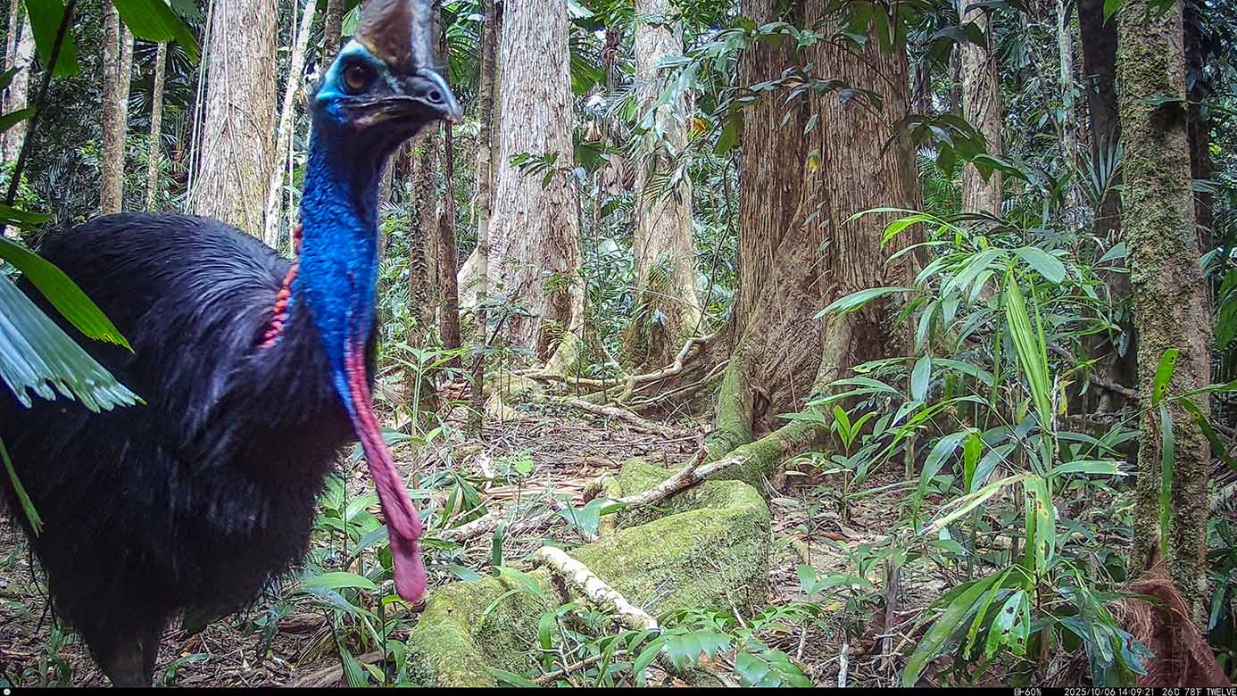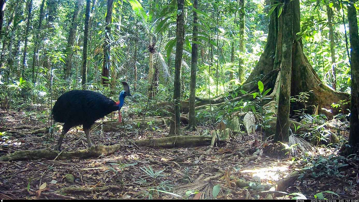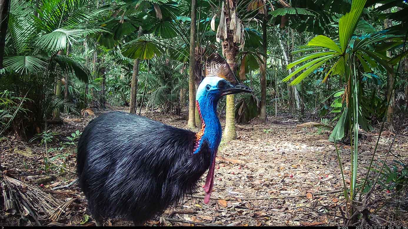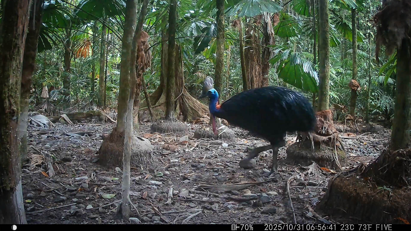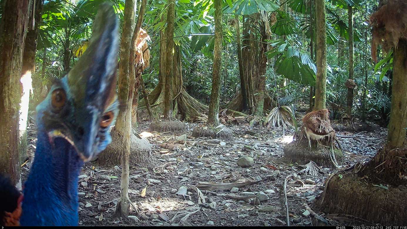 Camera Traps – October 2025 accrued 55-cassowaries, 43-dingoes and 56-feral pigs.  Against the cumulative monthly average, cassowary numbers fell by 43%, dingo numbers increased by 2% and feral-pig numbers plummeted by 71%.  Against October 2024, cassowary sightings rose by 104%, dingo numbers increased by 78% and feral-pig sightings decreased by 78%.