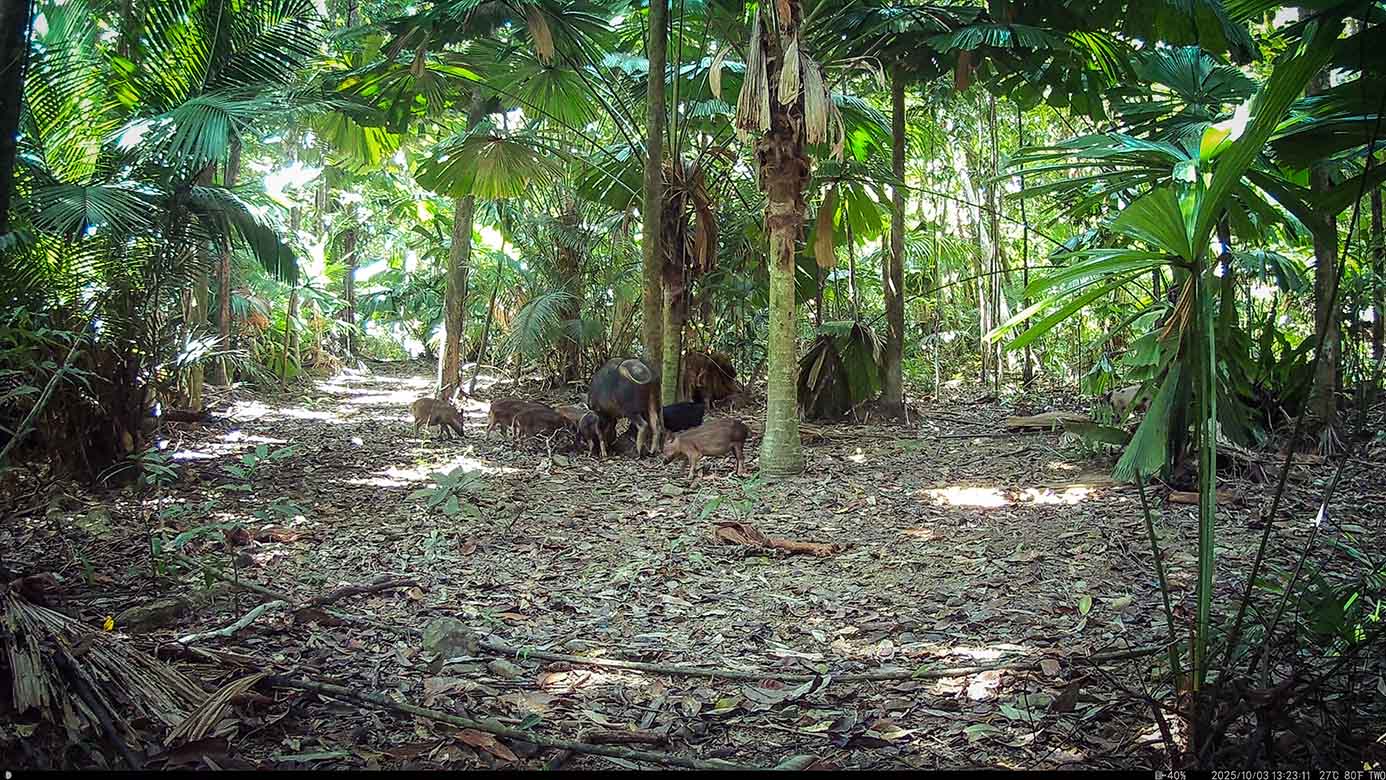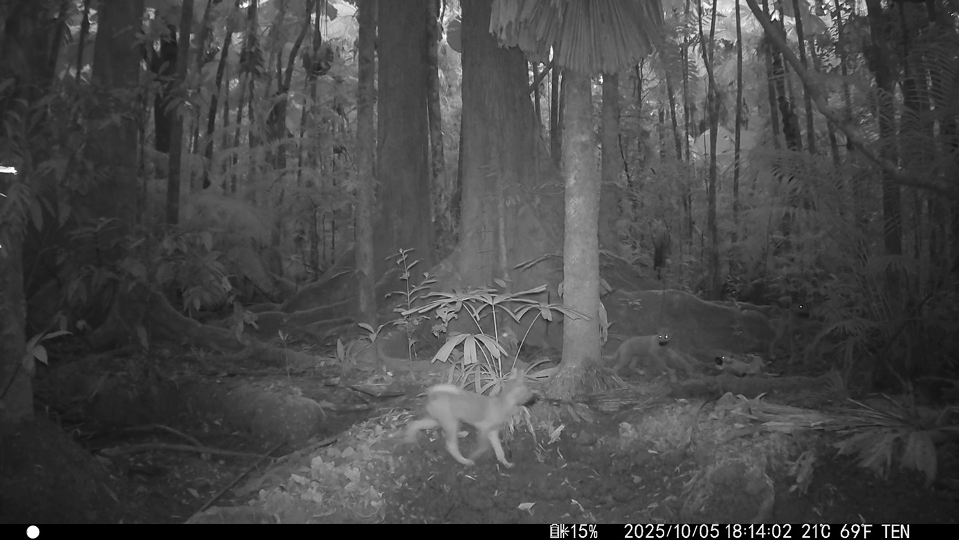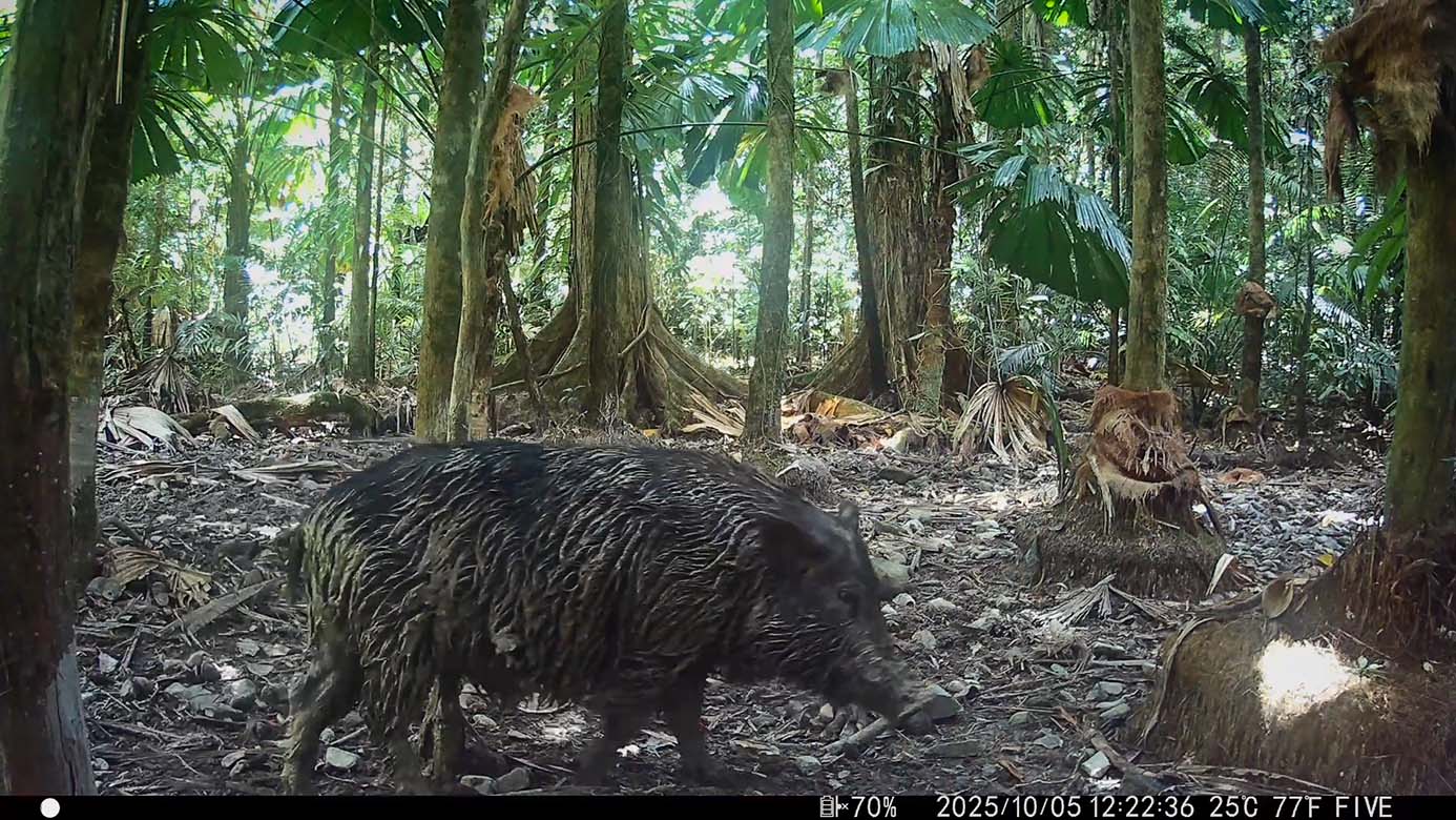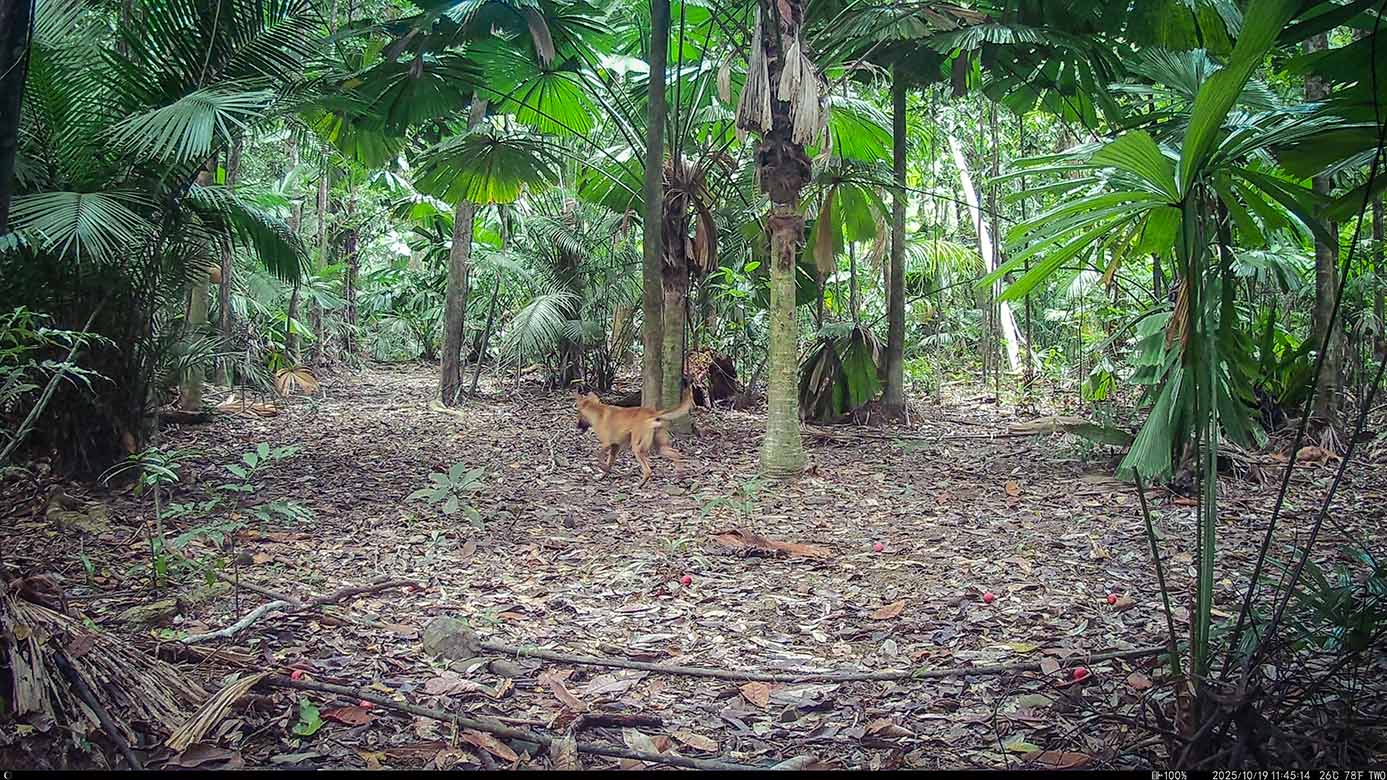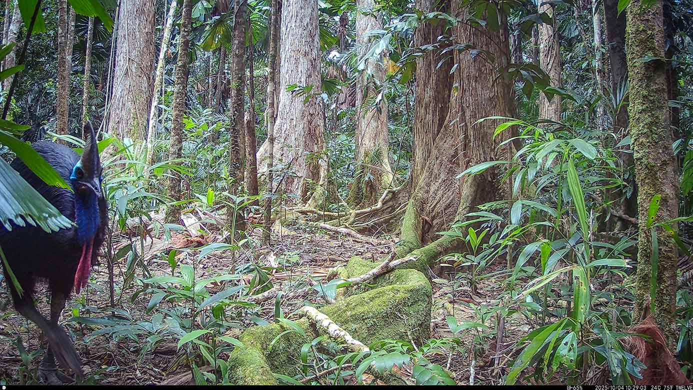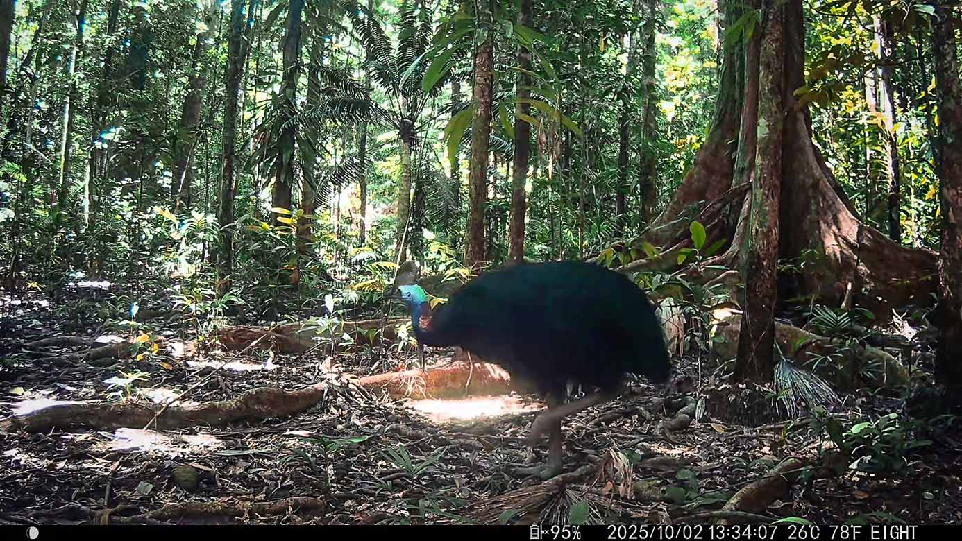 Camera Traps – October 2025 accrued 55-cassowaries, 43-dingoes and 56-feral pigs.  Against the cumulative monthly average, cassowary numbers fell by 43%, dingo numbers increased by 2% and feral-pig numbers plummeted by 71%.  Against October 2024, cassowary sightings rose by 104%, dingo numbers increased by 78% and feral-pig sightings decreased by 78%.